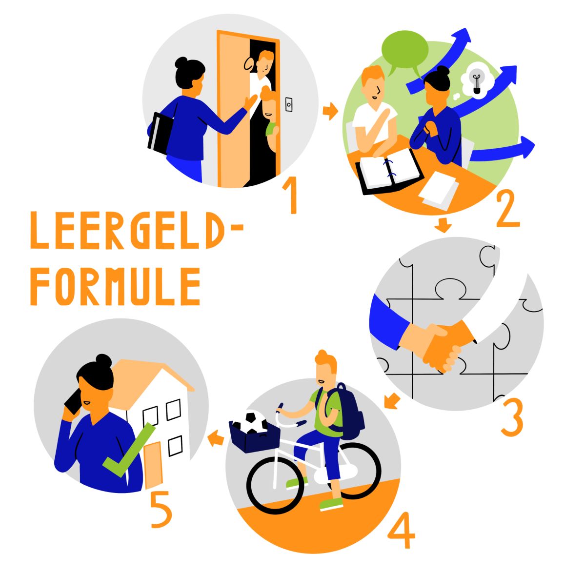 Bij Stichting Leergeld werken we met onze eigen unieke formule. Hieronder zie je de verschillende stappen van onze formule.